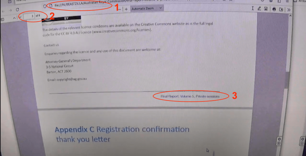 Item 1 (in red), as circled on the above computer screen image, identifies that the disinformation document is on a private computer and not on the official Child Abuse Royal Commission website.