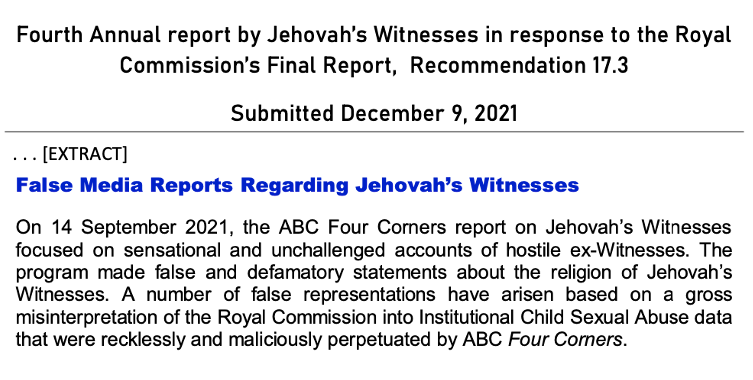 The very day before, on 9 December 2021, the Jehovah’s Witnesses submitted a formal ‘complaint’ to the Australian National Office for Child Safety in relation to the ABC Four Corners report that also featured the Bathurst Congregation’s Kingdom Hall.
