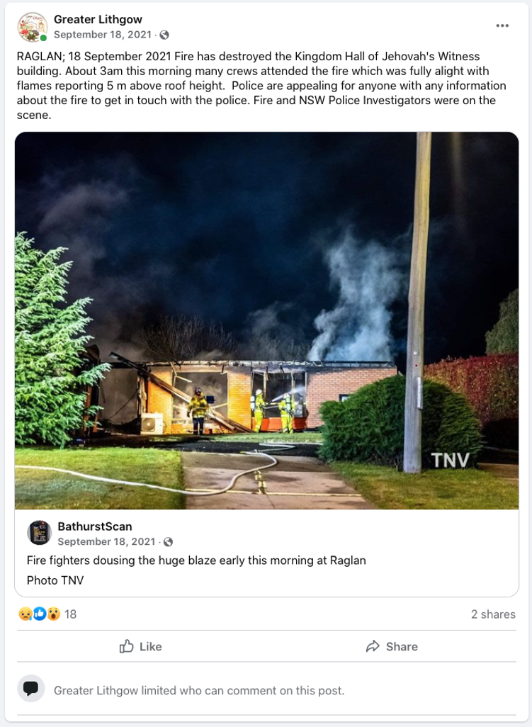Five days after the ABC Four Corners program aired, in the early morning hours of Saturday 18 September 2021, the Kingdom Hall of Jehovah’s Witnesses in Raglan, NSW, was completely destroyed by fire. The premises were not in regular use at the time due to the COVID pandemic.