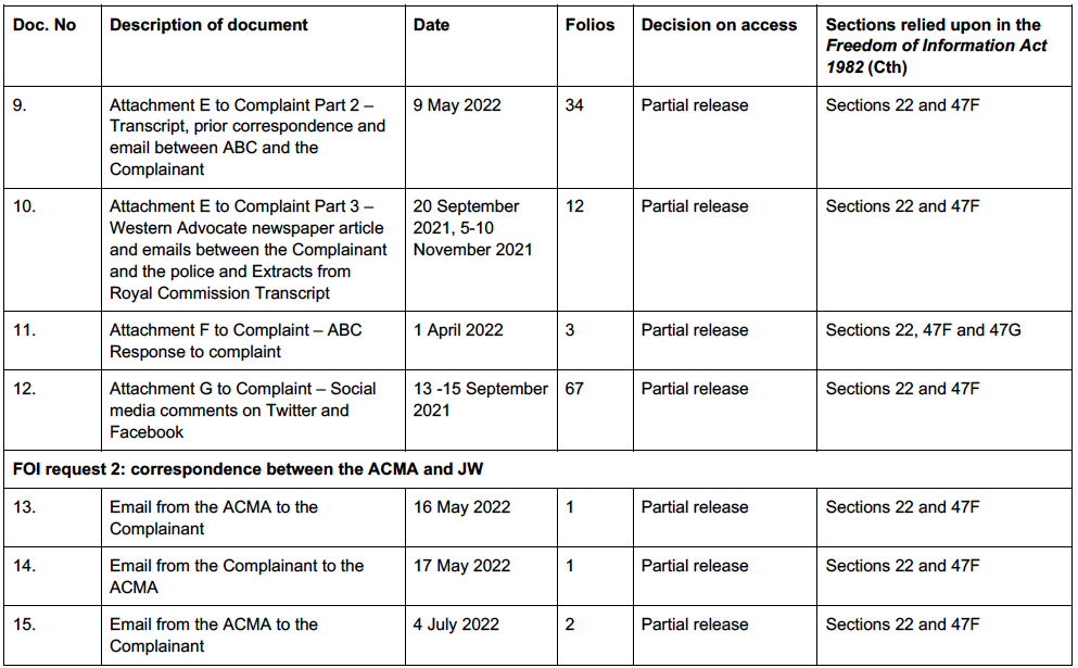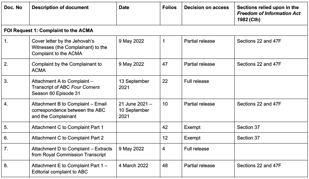 The documents released under the Freedom of Information Act by ACMA reveal the extensive lengths that Jehovah’s Witnesses Congregations Limited, Watchtower Bible and Tract Society of Australia Limited, and the Christian Congregation of Jehovah’s Witnesses (Australasia) Limited, went to in trying to have the ABC Four Corners program on the Jehovah’s Witnesses